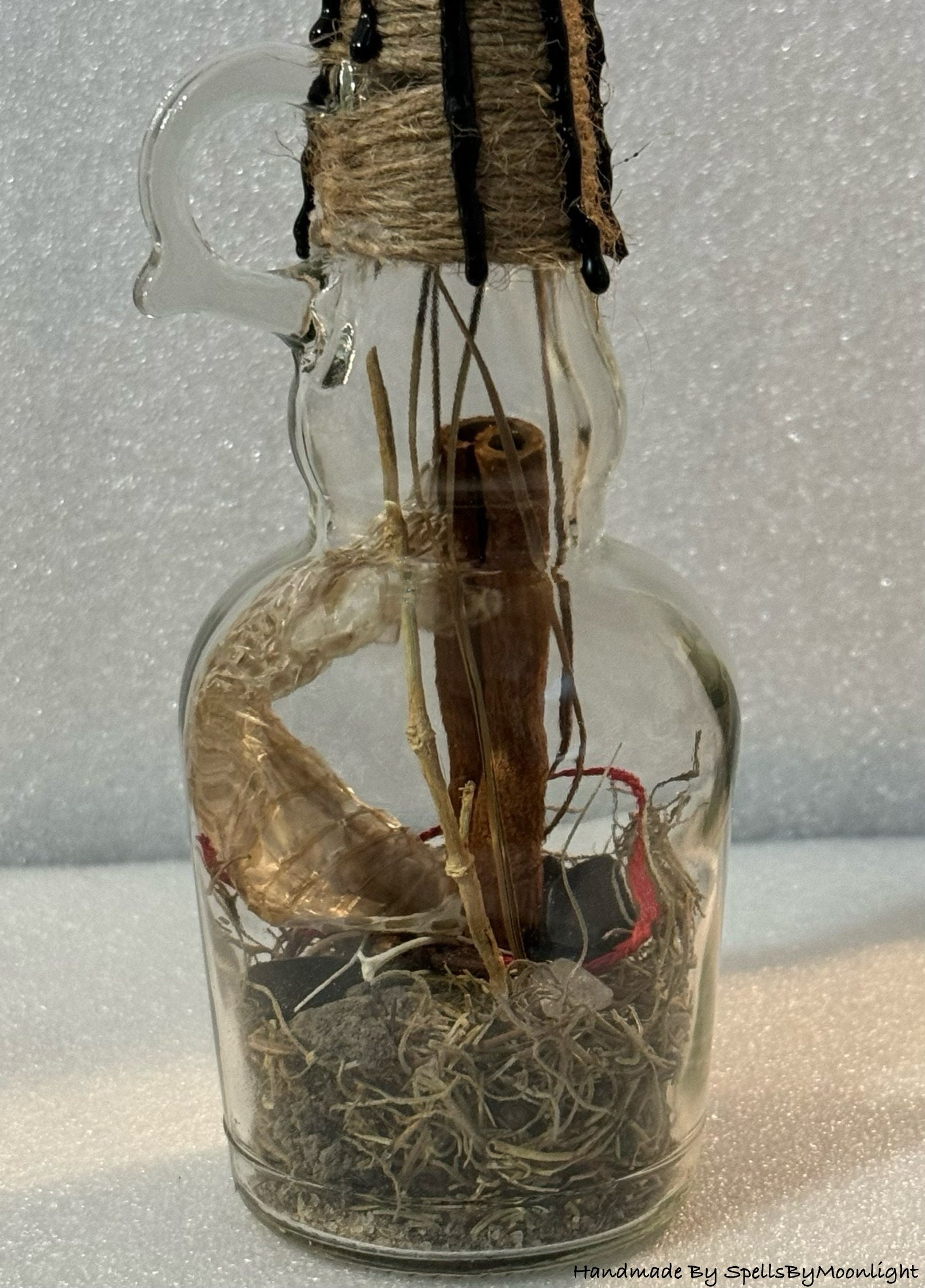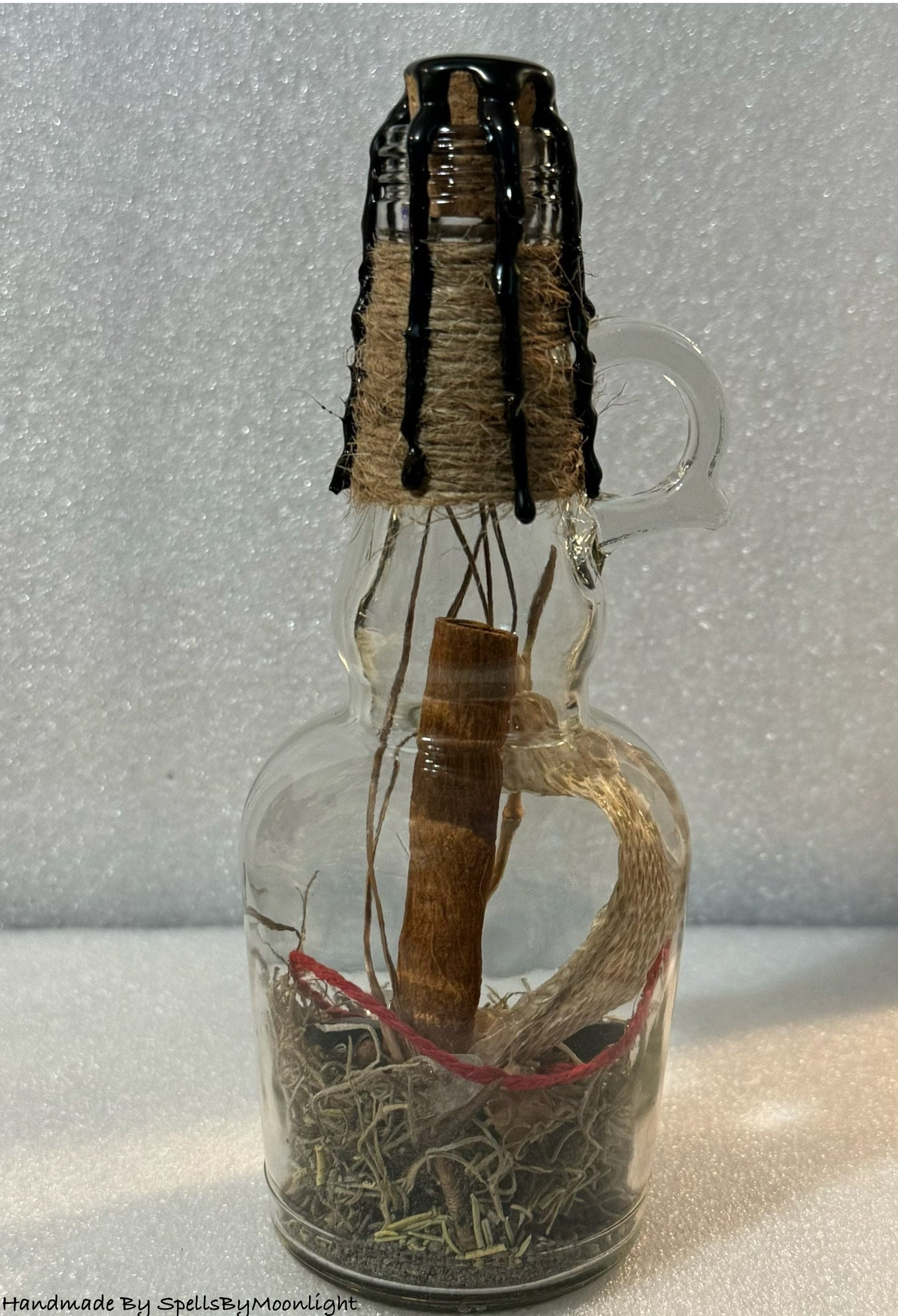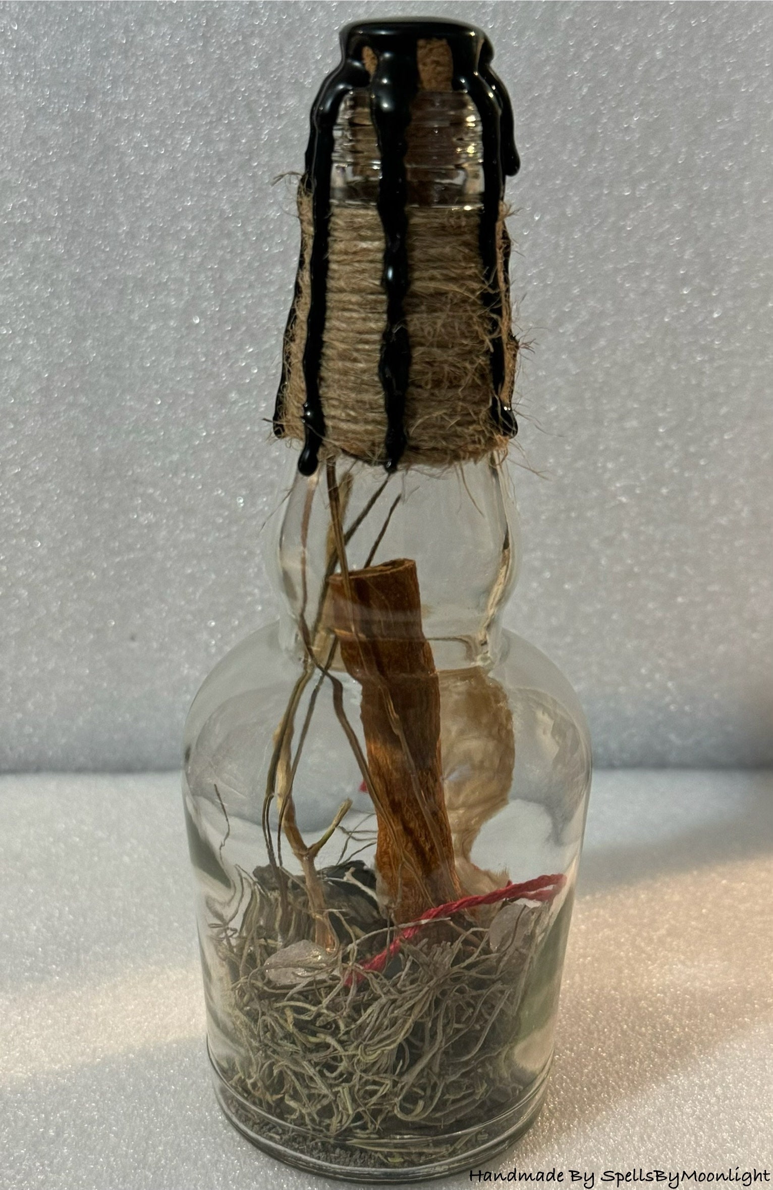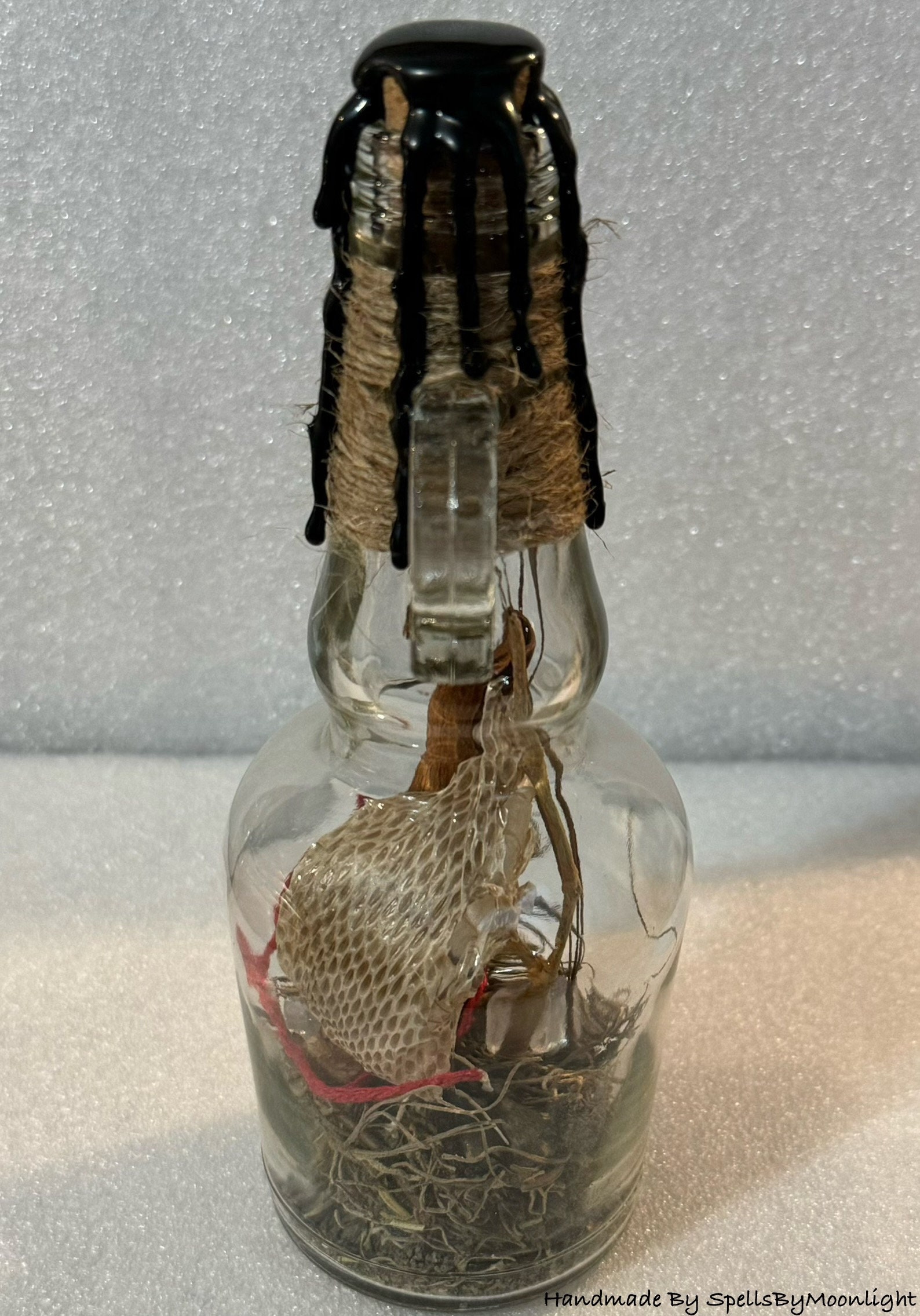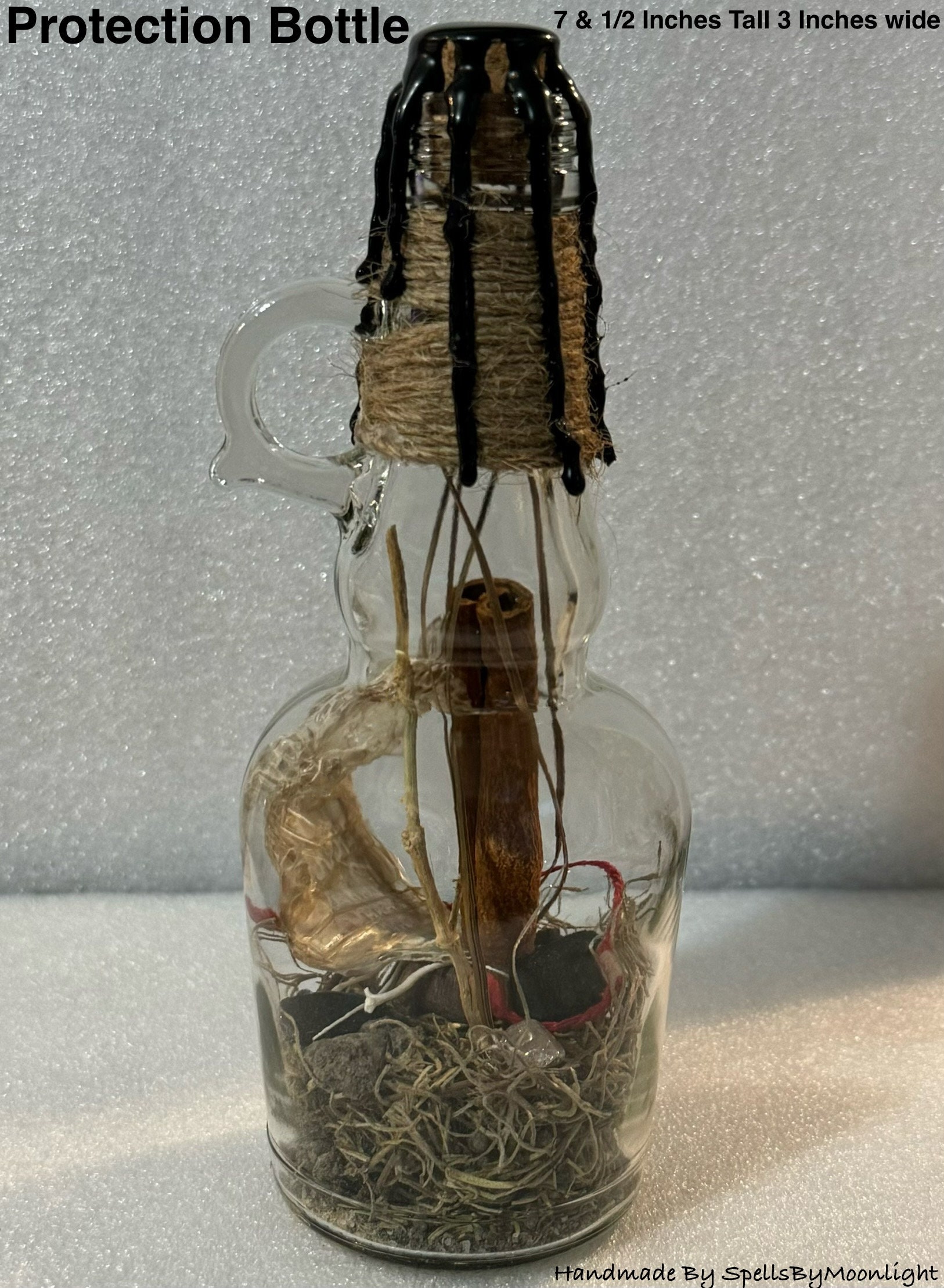 I created this Protection Spell Bottle with the intention of protecting you & your space from any type of Negative Energy and to return anything Negative sent to you back to the person who sent it! When you receive your spell Bottle you should hold it and set your specific intention to make it your own. The Bottle is 7 & 1/2 inches Tall and 3 inches Wide and includes: Pine Needles, Graveyard Dirt, Real Snake Skin, Red String, Spanish Moss, Rusty Nails, A Cinnamon Stick, Black Obsidian, Protection Salt, Stinging Nettle, Puncture Vine, Camel Thorn, Rosemary, Whole Cloves, Real Rattlesnake Rib Bones, and Clear Quartz. It is Sealed with Black Wax. Listing is for one Bottle. Once your order is placed I do not accept cancelations or returns. If you have an issue with your order, contact me so I can resolve it ASAP. I am required to tell you this listing is sold as a curiosity and I am not able to make any claims regarding effectiveness or outcome of products