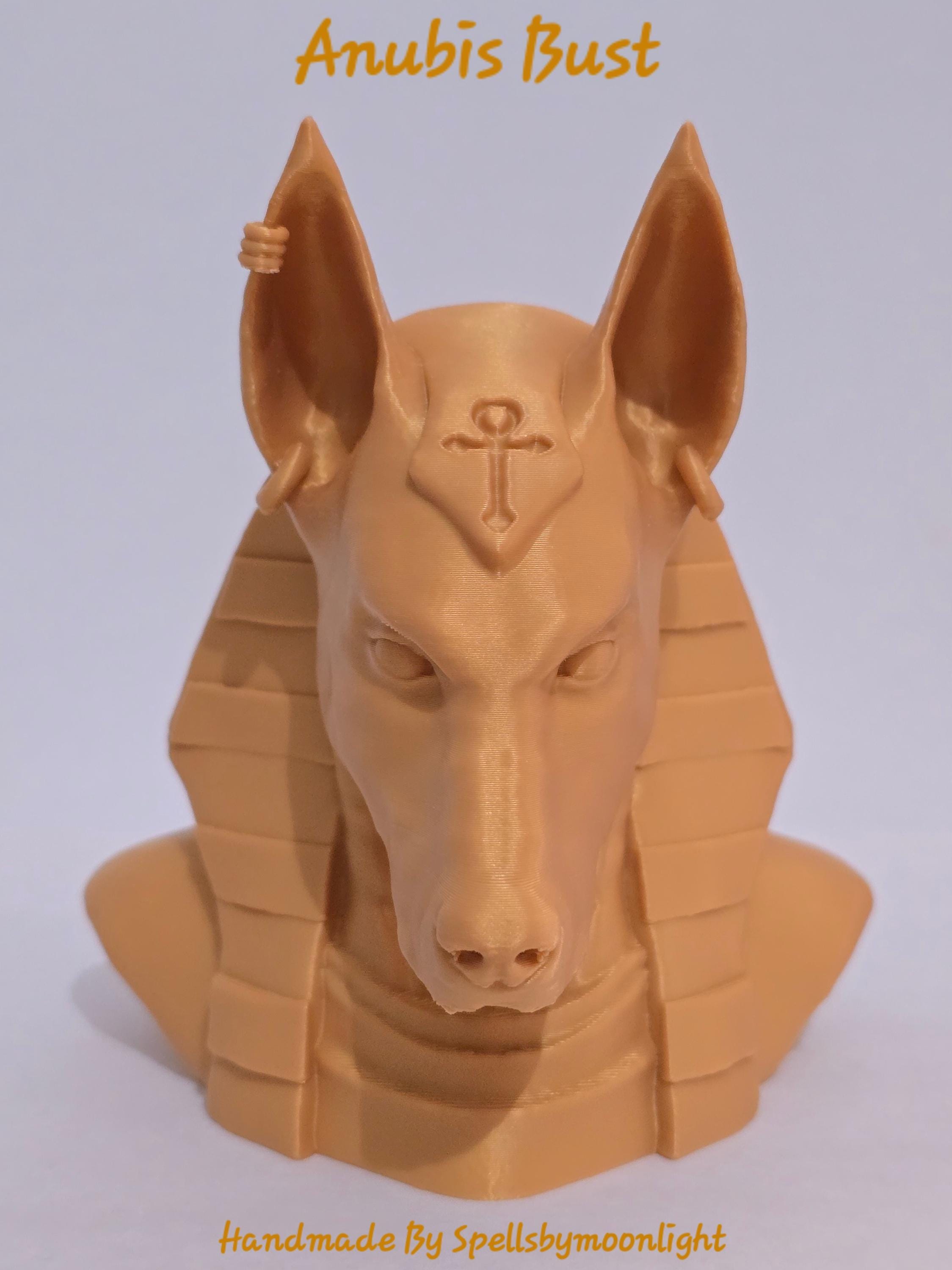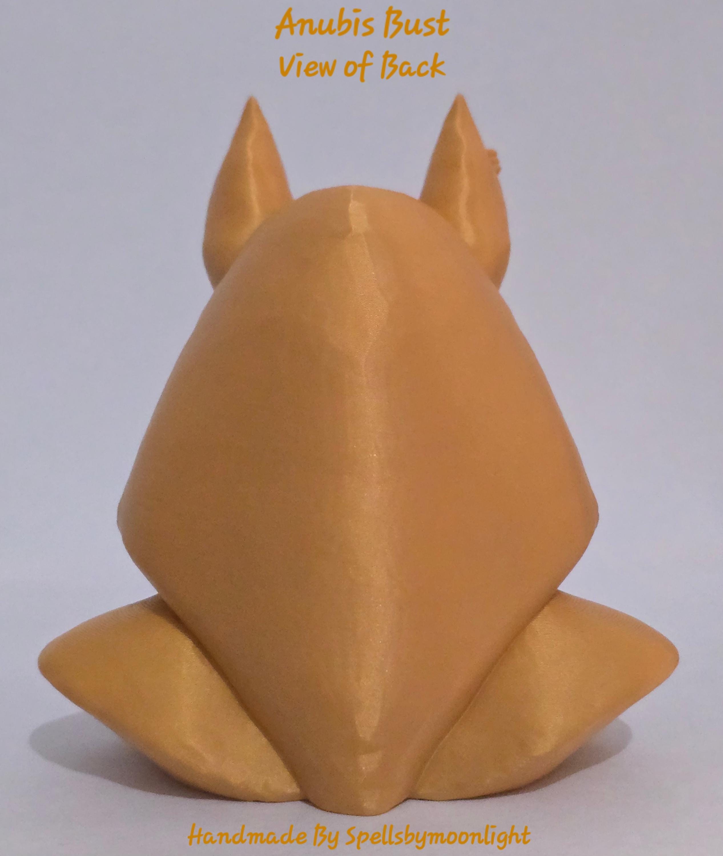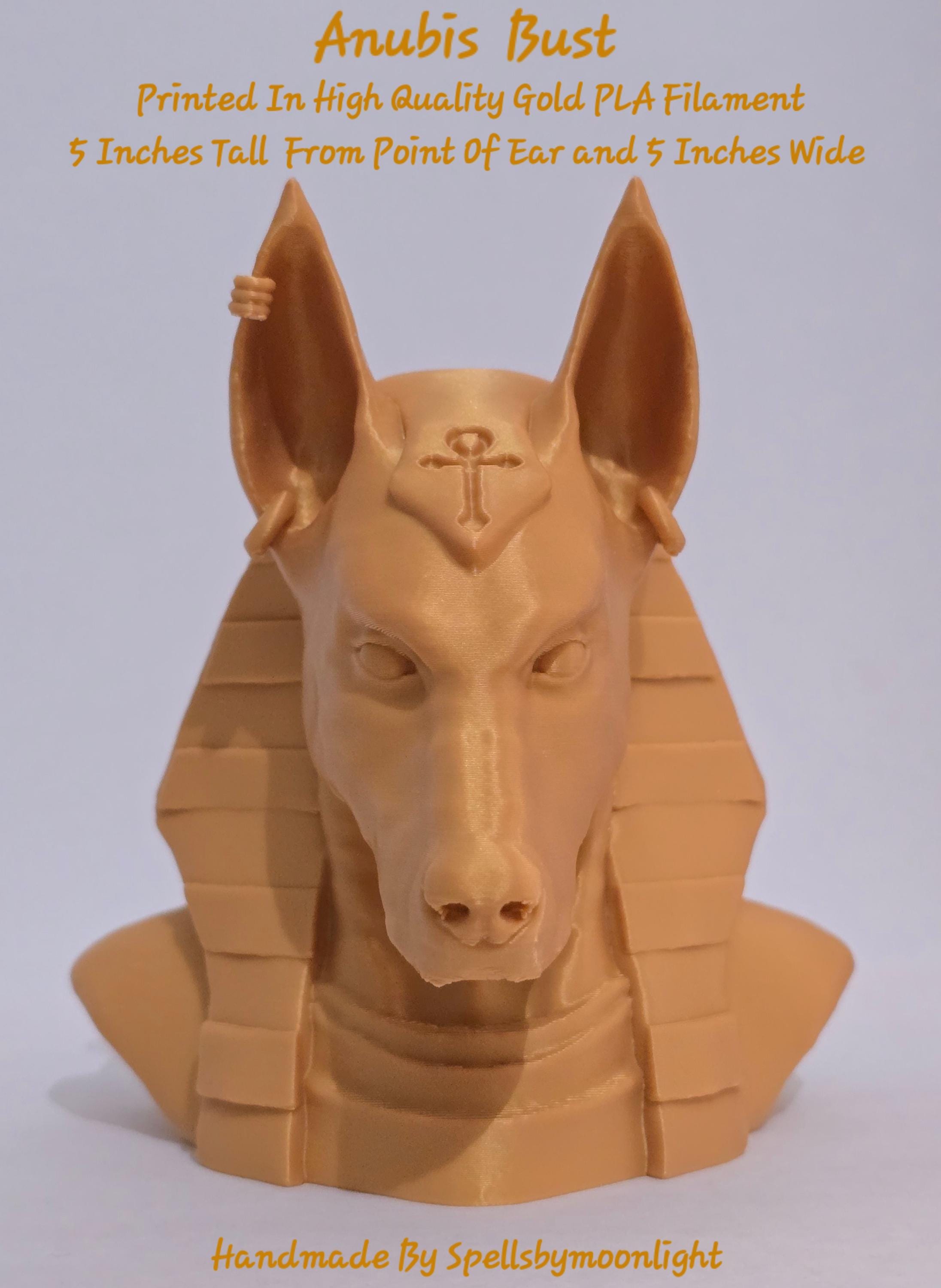 This listing is for One 3D Printed Egyptian God Anubis Bust/Statue in the color Gold. The Statues are not painted, they are Printed in High Quality PLA so you don't have to worry about paint chipping, peeling, or rubbing off! Please note that colors may differ slightly from how it appears on your screen due to varying monitor/Phone settings. The Statue isapproximately 5 Inches Tall from the tip of the ears to the bottom, and 5 Inches Wide. If you hold the Statue close to your face you can see very minimal lines produced by the 3D Printer. At a normal distance they aren't noticeable. The lines are minimal in appearance because I have a high end 3D Printer! These Statues are perfect for Your Alter, as an offering to Anubis, and also make great gifts! *Please note that due to the way the supports form during the 3D Printing process there may be more noticeable lines on the very bottom of the neck/chin on the underside..this is NOT visible when the Bust/Statue is sitting and does not effect the look at all! See photos*