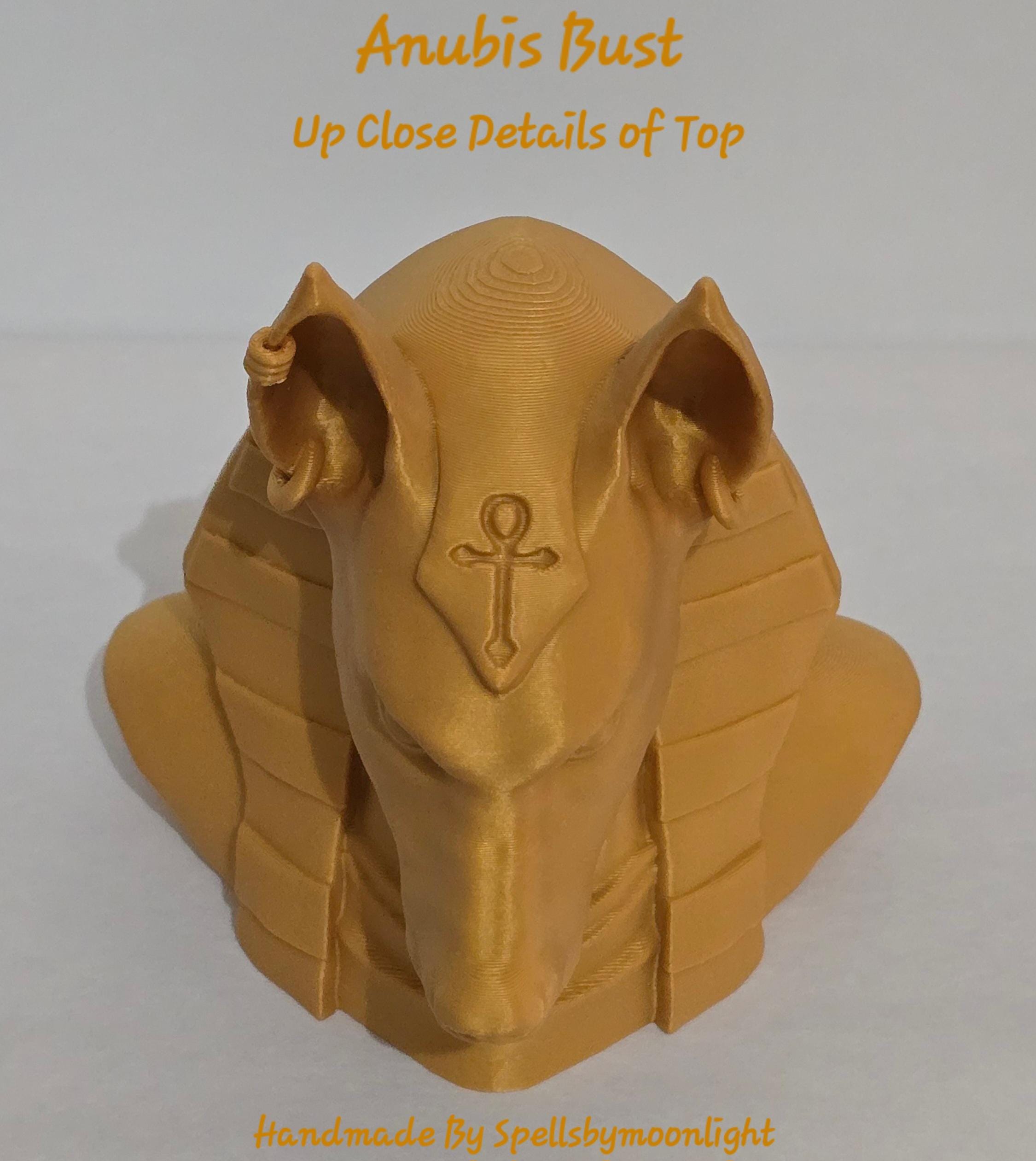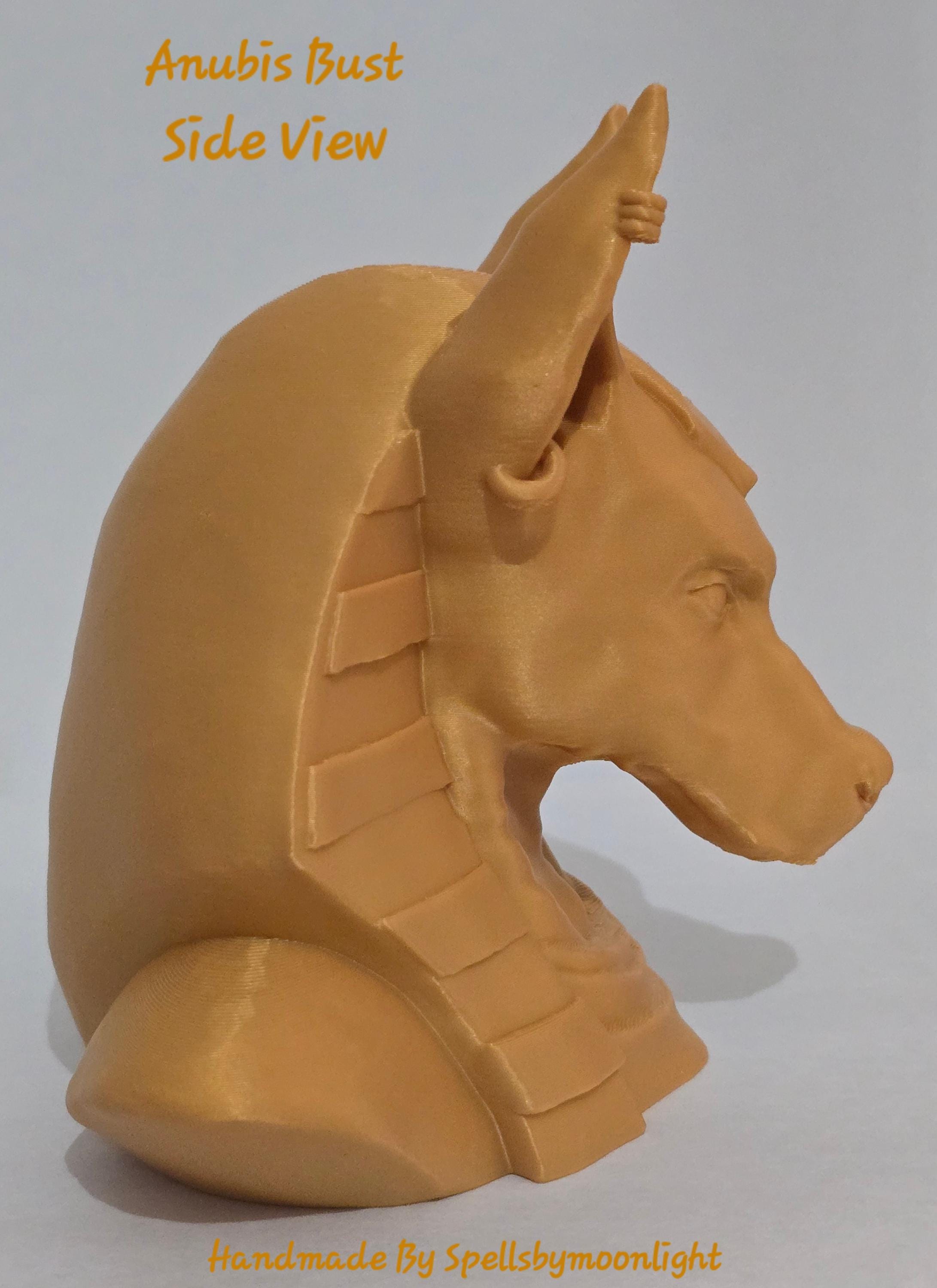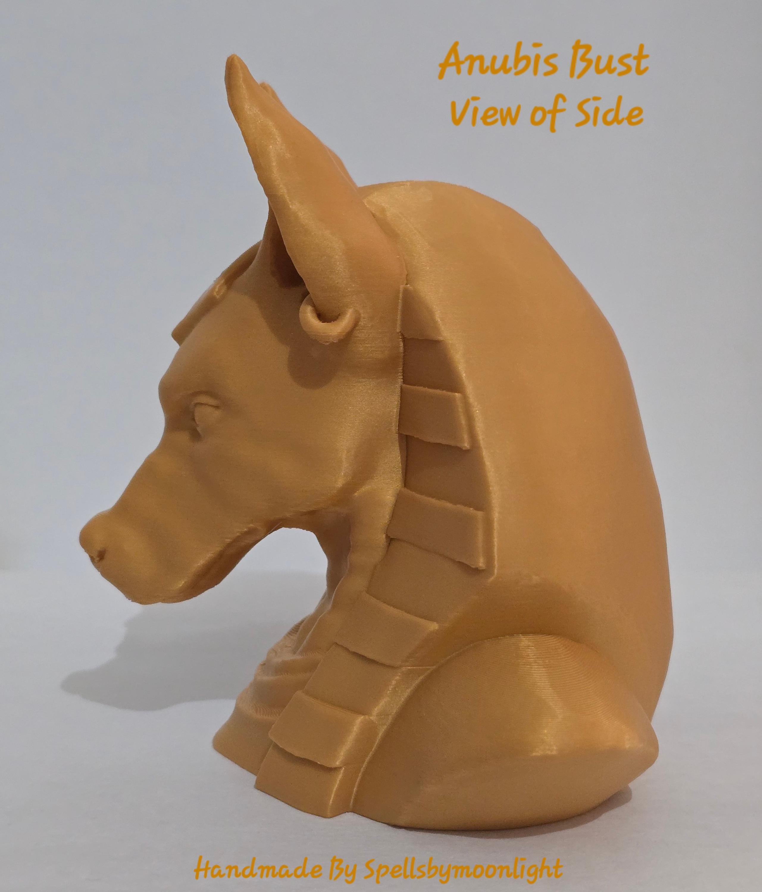 This listing is for One 3D Printed Egyptian God Anubis Bust/Statue in the color Gold. The Statues are not painted, they are Printed in High Quality PLA so you don't have to worry about paint chipping, peeling, or rubbing off! Please note that colors may differ slightly from how it appears on your screen due to varying monitor/Phone settings. The Statue isapproximately 5 Inches Tall from the tip of the ears to the bottom, and 5 Inches Wide. If you hold the Statue close to your face you can see very minimal lines produced by the 3D Printer. At a normal distance they aren't noticeable. The lines are minimal in appearance because I have a high end 3D Printer! These Statues are perfect for Your Alter, as an offering to Anubis, and also make great gifts! *Please note that due to the way the supports form during the 3D Printing process there may be more noticeable lines on the very bottom of the neck/chin on the underside..this is NOT visible when the Bust/Statue is sitting and does not effect the look at all! See photos*