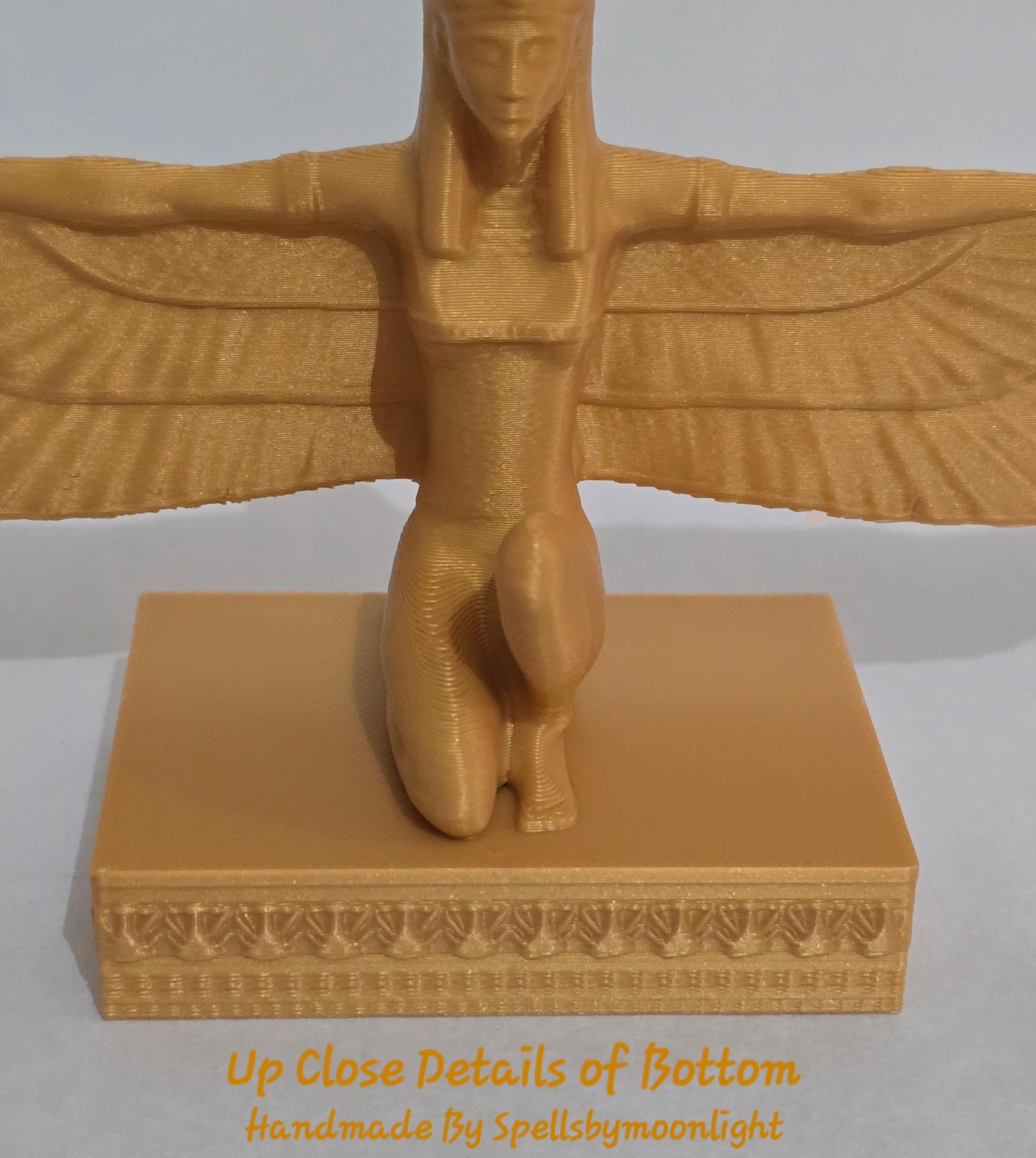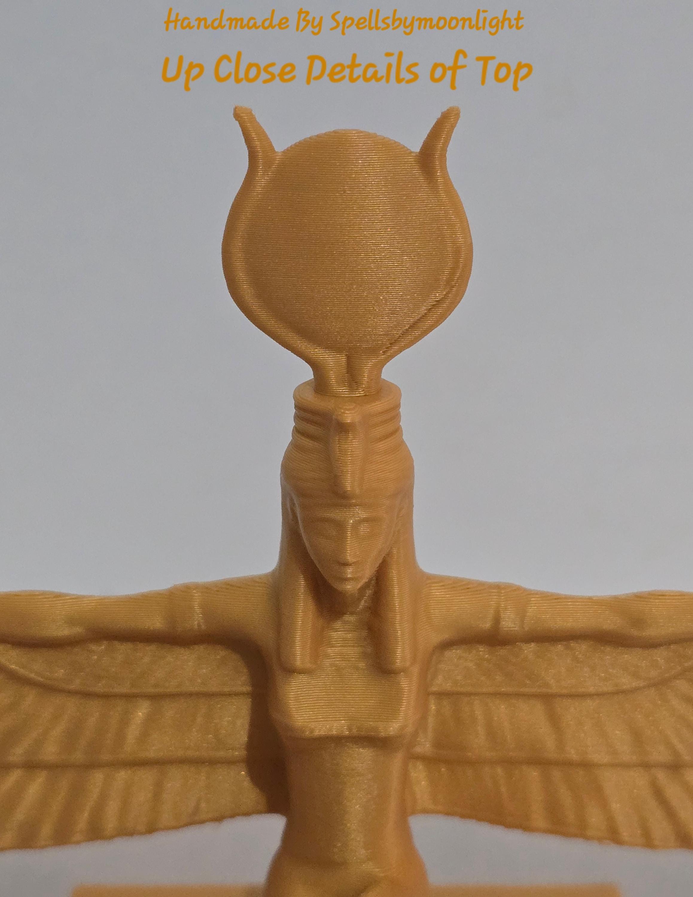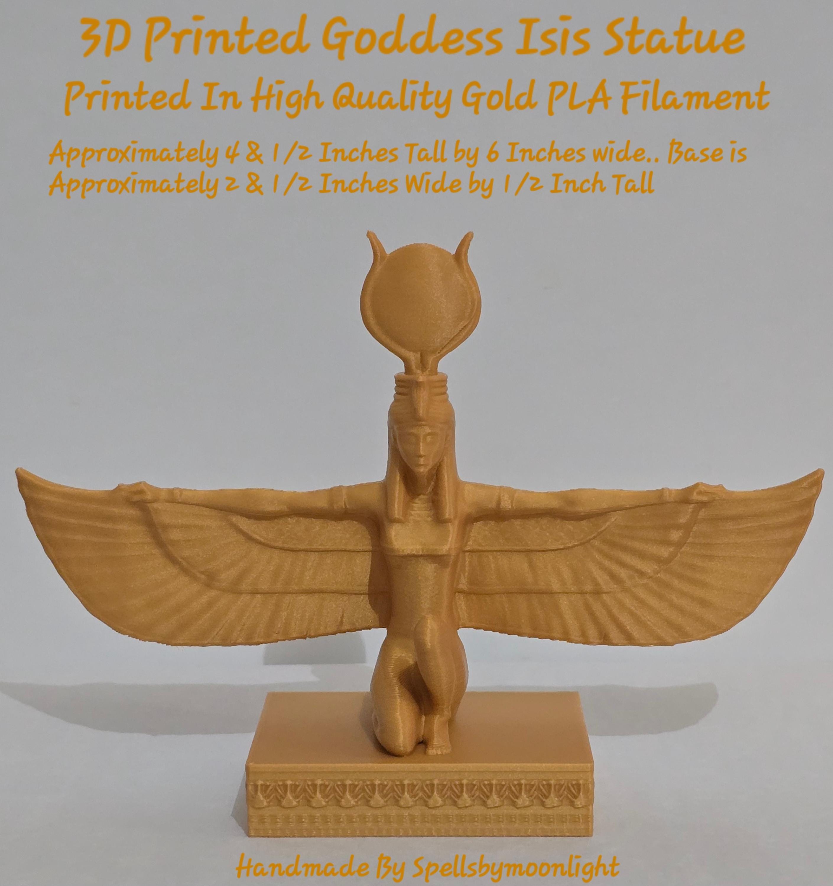 This listing is for One 3D Printed Egyptian Goddess Isis Statue in the color Gold. The Statues are not painted, they are Printed in High Quality PLA so you don't have to worry about paint chipping, peeling, or rubbing off! Please note that colors may differ slightly from how it appears on your screen due to varying monitor/Phone settings. The Statue is Approximately 4 & I/2 Inches Tall by 6 Inches wide.. Base is Approximately 2 & 1/2 Inches Wide by 1 /2 Inch Tall. If you hold the Statue close to your face you can see very minimal lines produced by the 3D Printer. At a normal distance they aren't very noticeable! The lines are minimal in appearance because I have a high end 3D Printer! These Statues are perfect for Your Alter, as an offering to Goddess Isis, and also make great gifts!