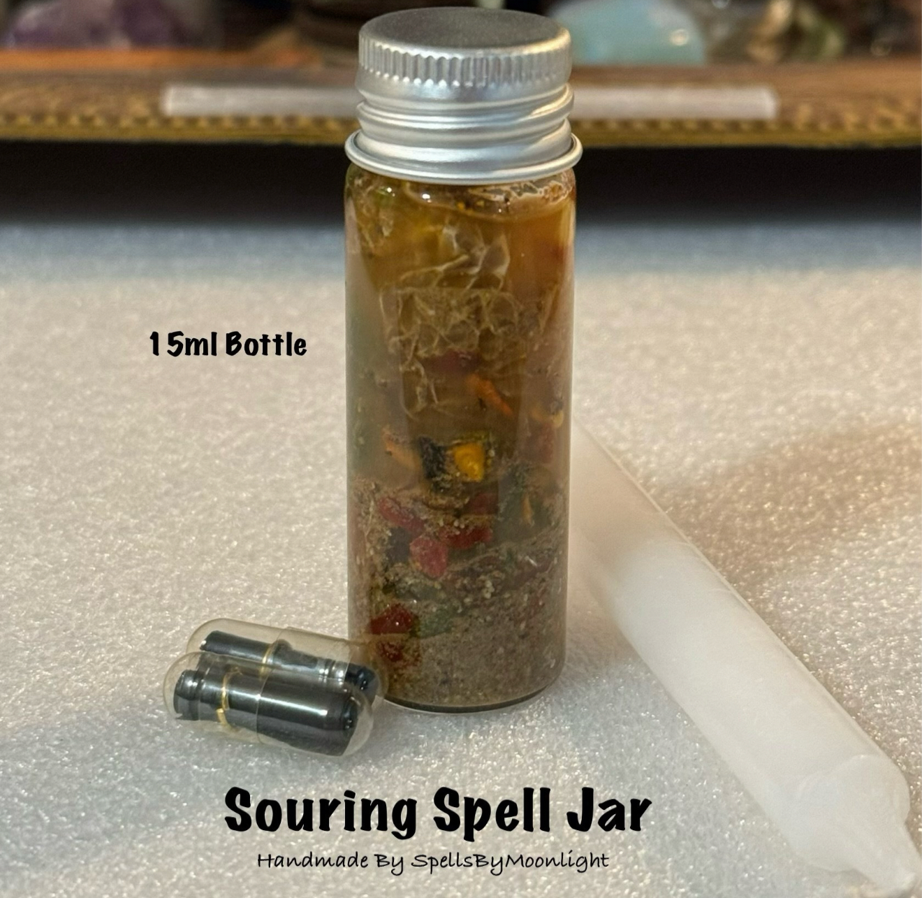 I created this Souring Spell Jar to make others lives turn sour! It can be used for: Removing someone from your life, Causing Chaos in someones life, Return To Sender, Karma Spells, Hexing, Banishing, Cursing, Jinxing, Break ups, and breaking connections. this is a 15ml Glass Jar that contains: Graveyard Dirt, Vinegar, Hot Pepper Flakes, Rusty Nails, Moss, Rattlesnake Skin, Cayenne Pepper Powder, and Black Pepper! **you write up to 3 peoples names and your intentions on the included scrolls inside the capsules, Put the scrolls in the Jar, replace the lid and use the candle to seal the Jar with wax. After the wax dries shake it while speaking your intentions. You can put it in the freezer, a cabinet, on your altar, or bury it.