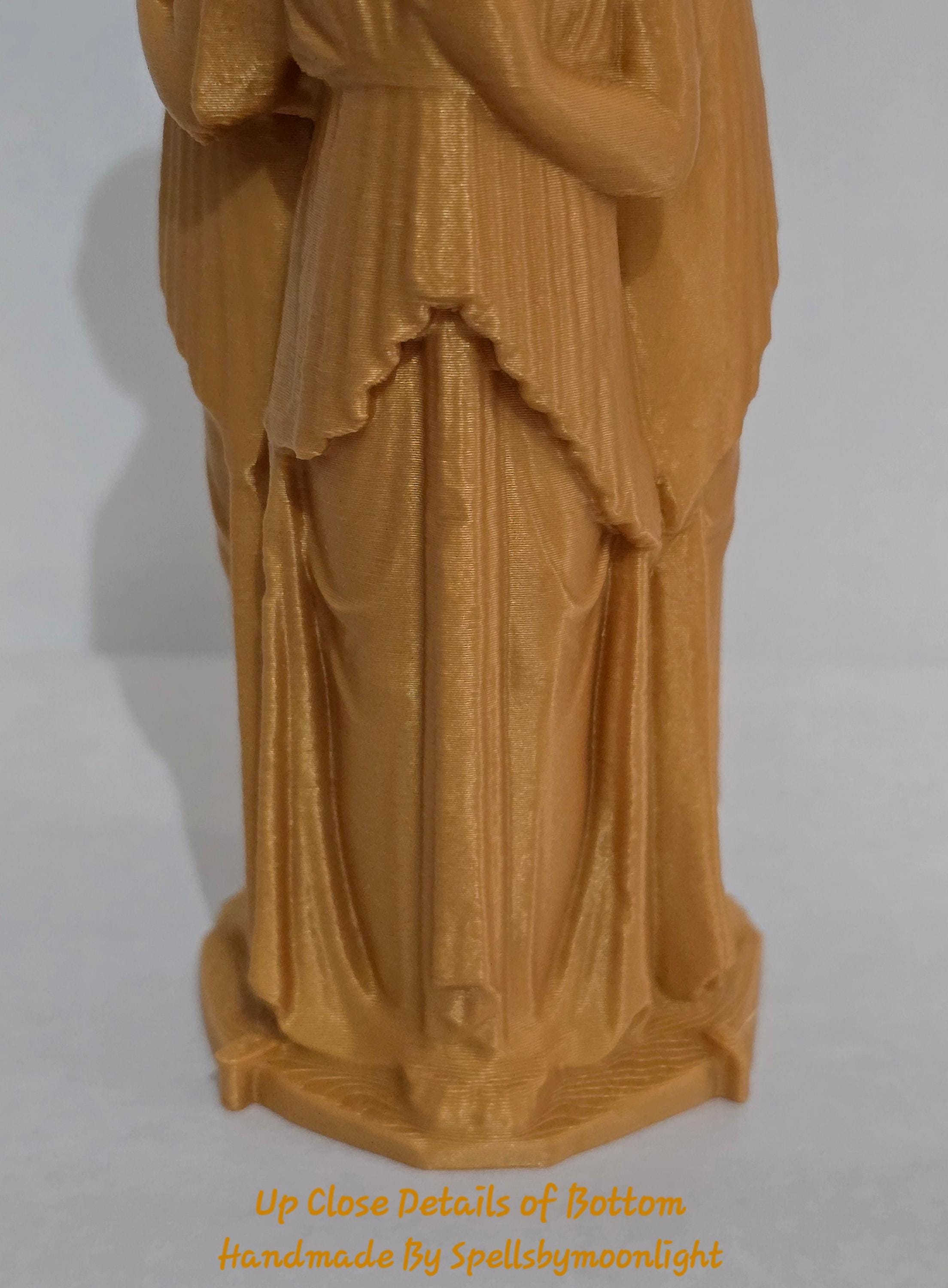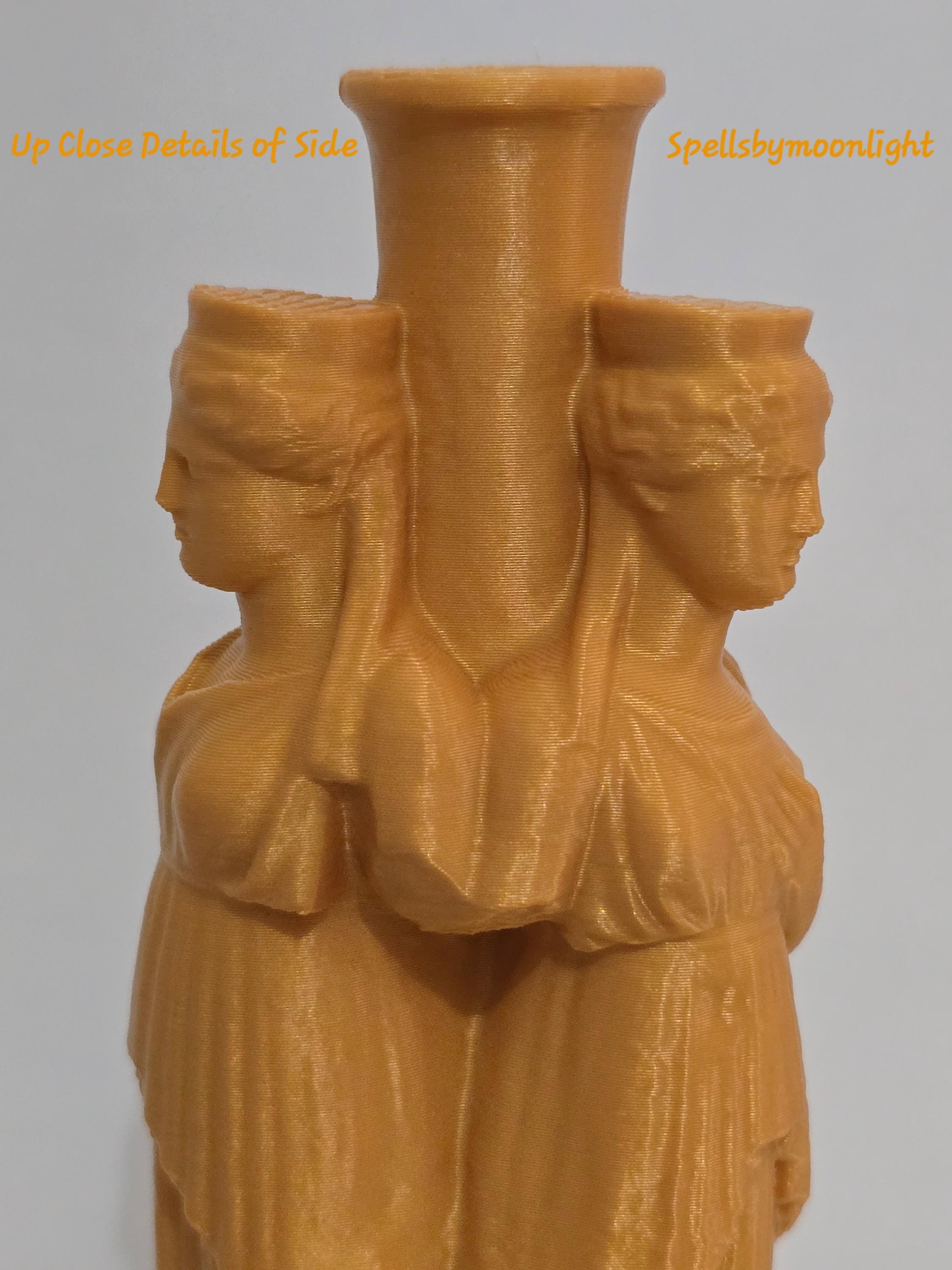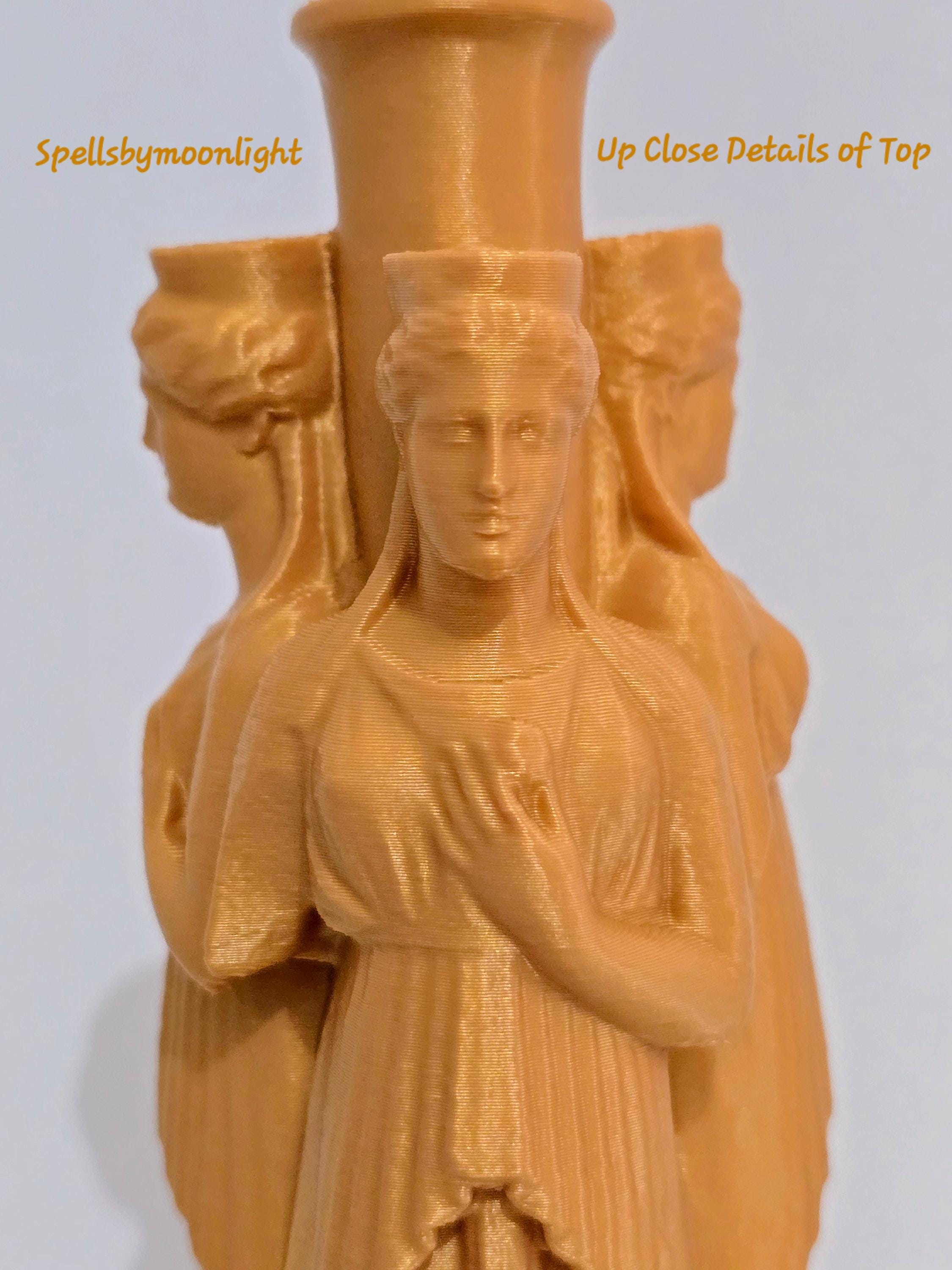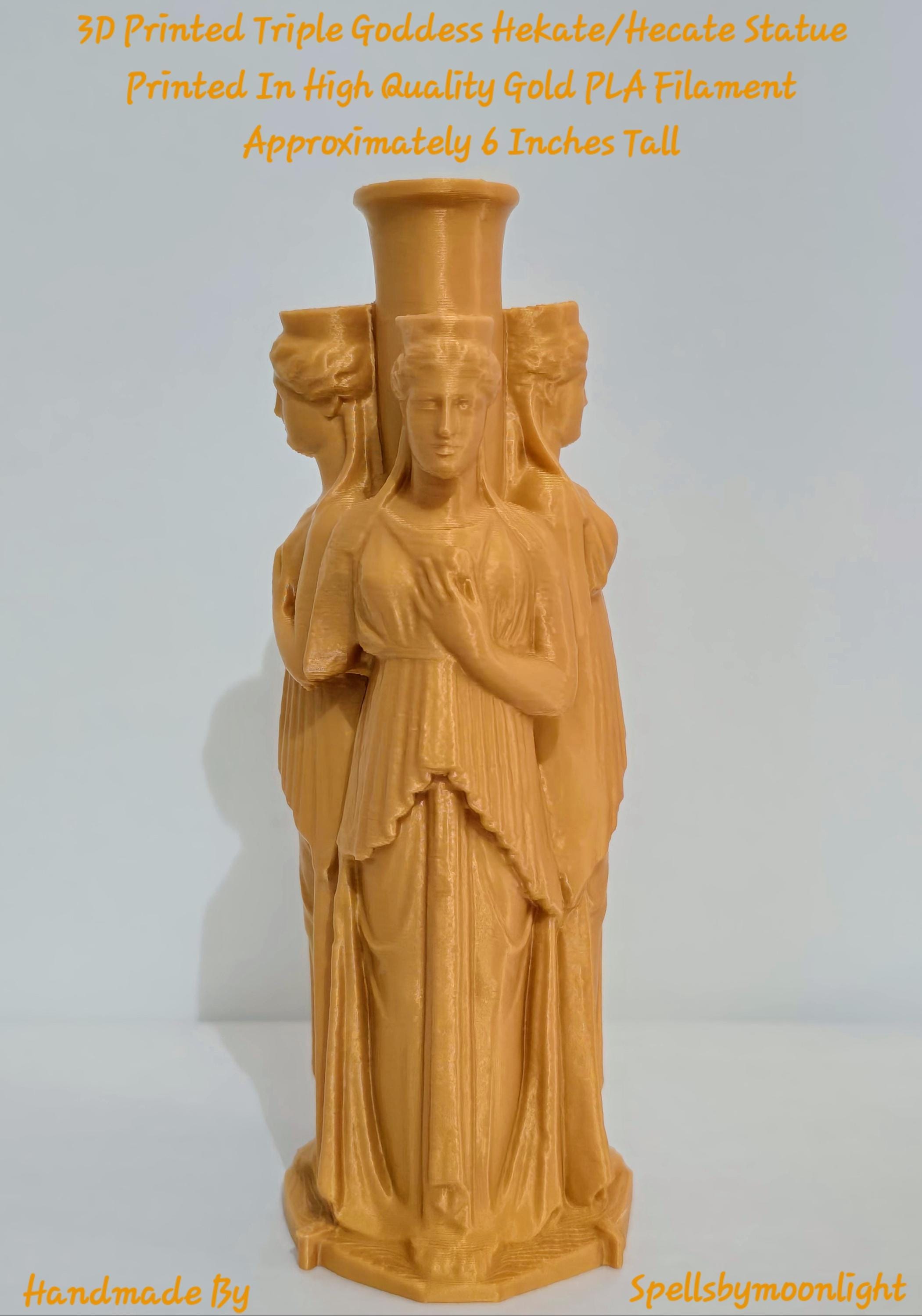 This listing is for One 3D Printed Triple Goddess Hekate/Hecate Statue in the color Gold. The Statues are not painted, they are Printed in High Quality PLA so you don't have to worry about paint chipping, peeling, or rubbing off! Please note that colors may differ slightly from how it appears on your screen due to varying monitor/Phone settings. The Statue isapproximately 6 Inches Tall. If you hold the Statue close to your face you can see very minimal lines produced by the 3D Printer. At a normal distance they aren't noticeable. The lines are minimal in appearance because I have a high end 3D Printer! These Statues are perfect for Your Alter, as an offering to Hekate/ Hecate, and also make great gifts! The artist Peter Farell, who I will give credit to below with a link did an amazing job at recreating Hecate on the Acropolis, including the slight lean of the Center Pillar that can be seen from a side view of the Statue! I love that this version is Historically correct!