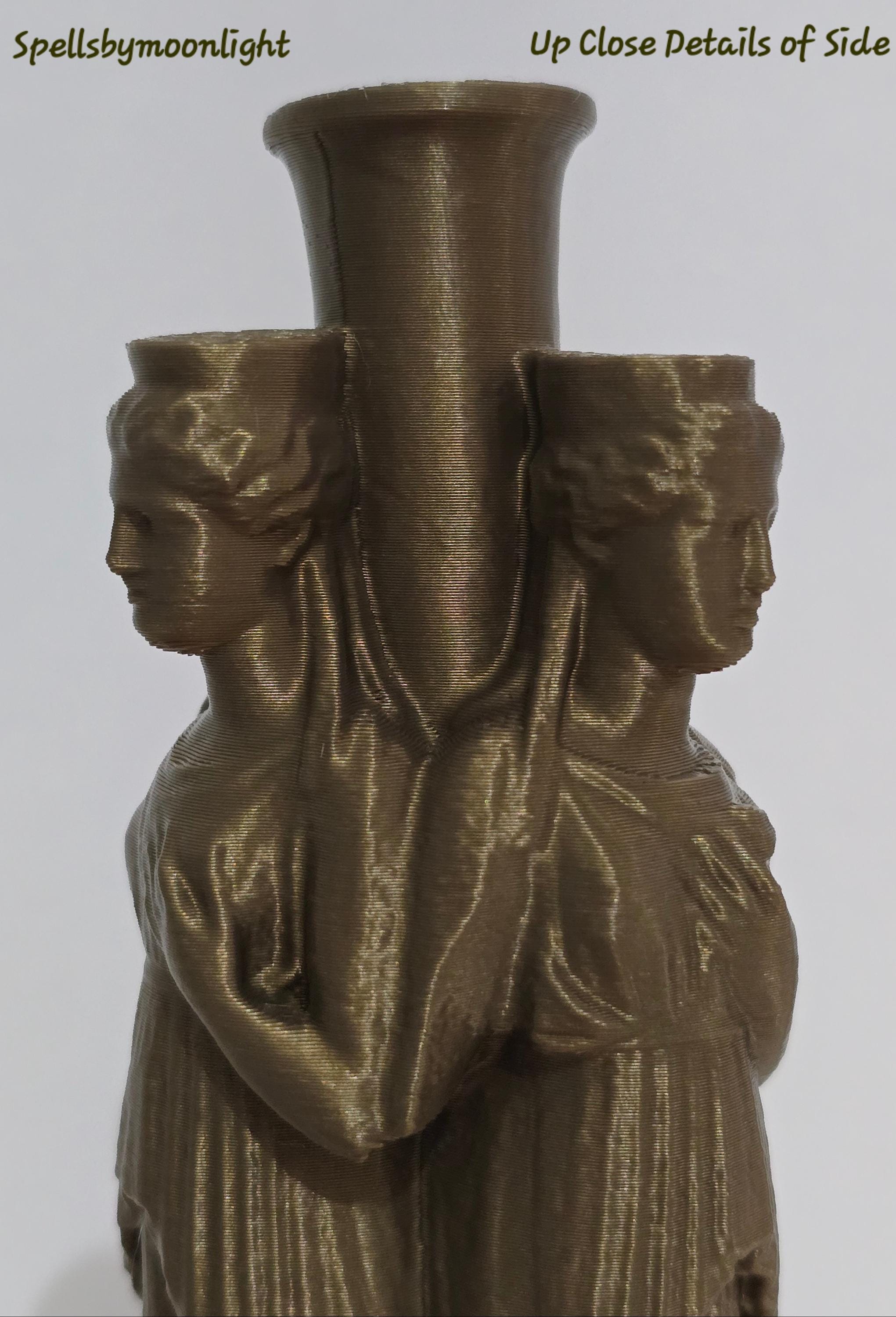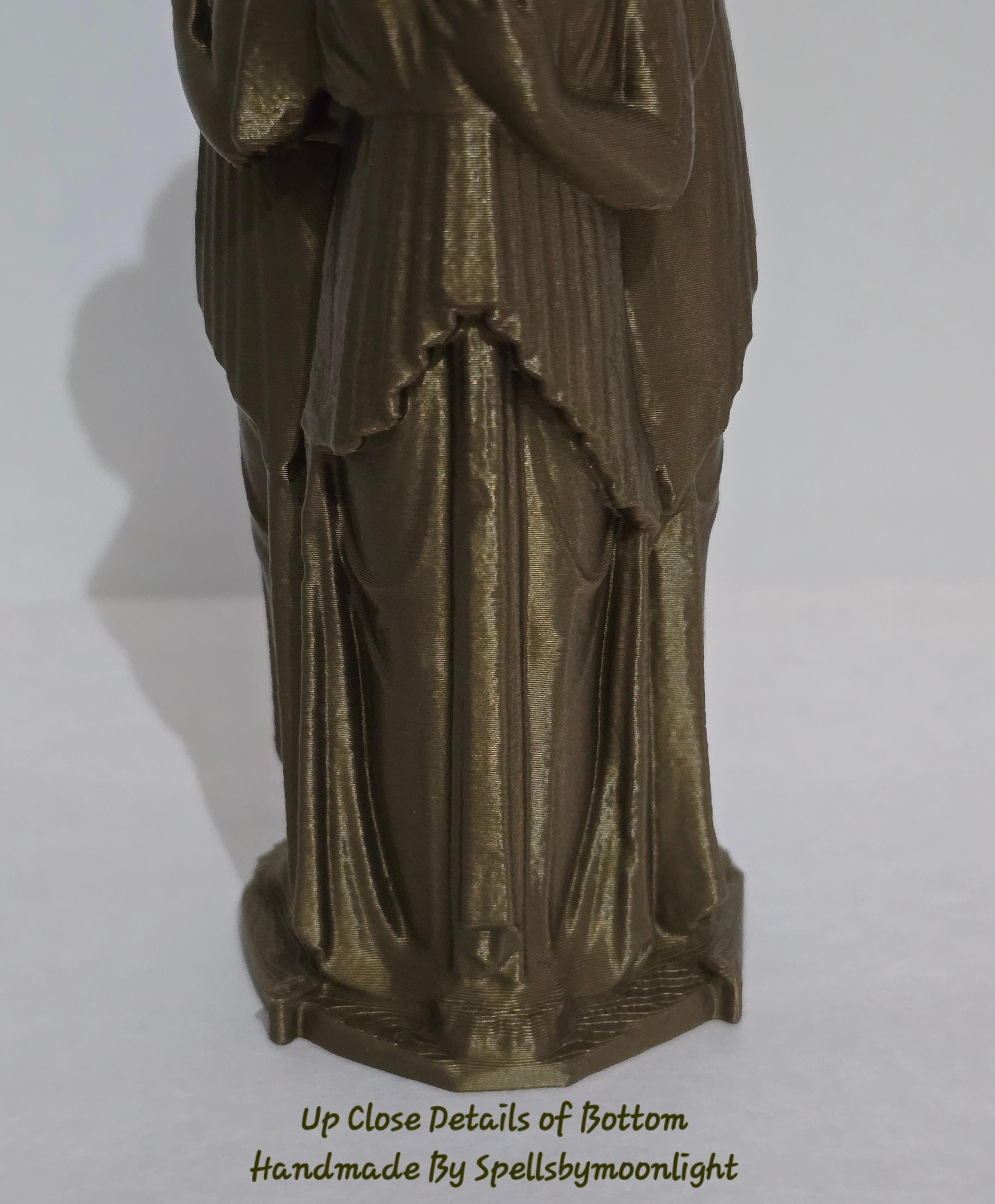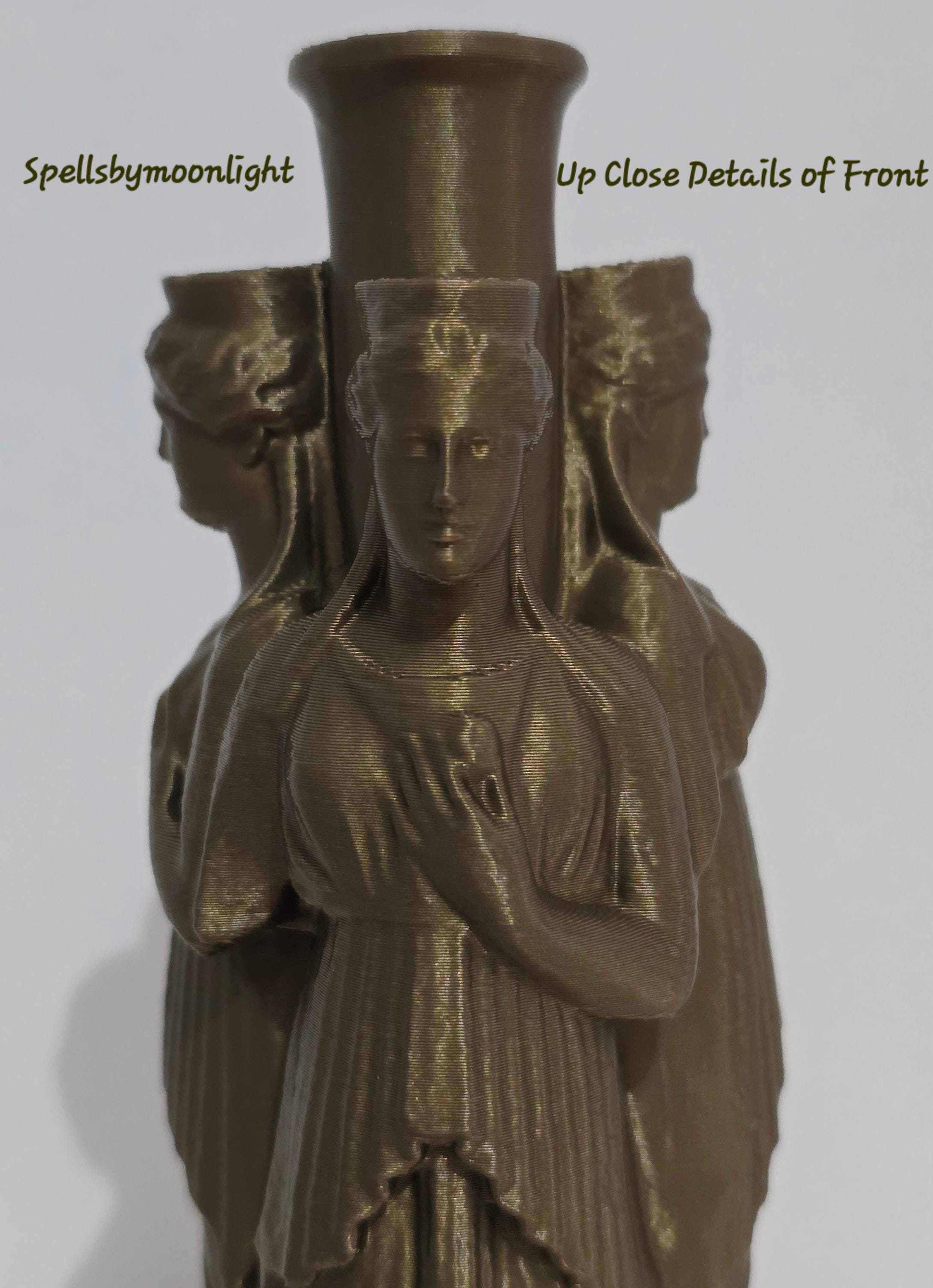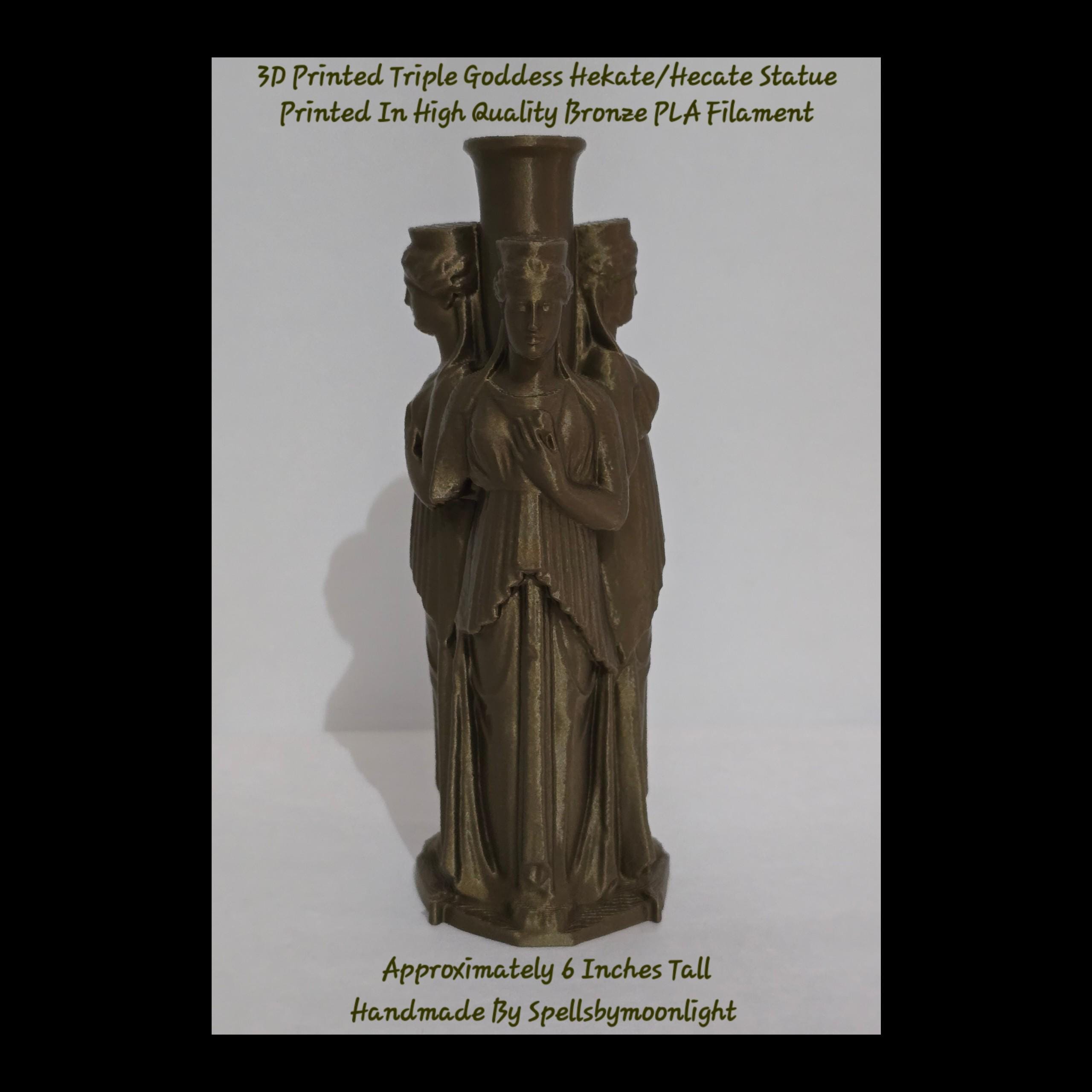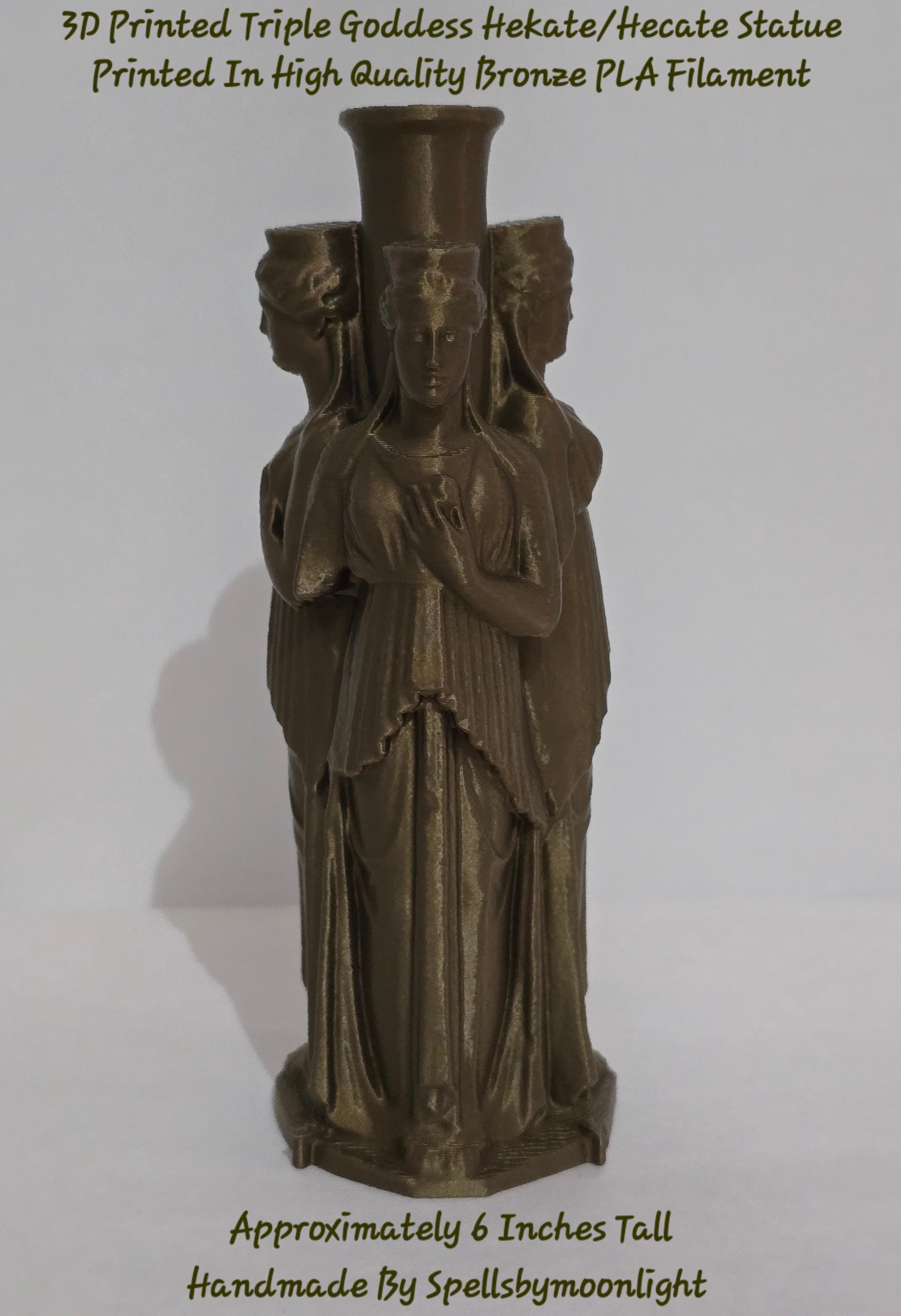 This listing is for One 3D Printed Triple Goddess Hekate/Hecate Statue in the color Bronze. The Statues are not painted, they are Printed in High Quality PLA so you don't have to worry about paint chipping, peeling, or rubbing off! Please note that colors may differ slightly from how it appears on your screen due to varying monitor/Phone settings. The Statue is approximately 6 Inches Tall. If you hold the Statue close to your face you can see very minimal lines produced by the 3D Printer. At a normal distance they aren't noticeable. The lines are minimal in appearance because I have a high end 3D Printer! These Statues are perfect for Your Alter, as an offering to Hekate/Hecate, and also make great gifts! The artist Peter Farell, who I will give credit to below with a link did an amazing job at recreating Hecate on the Acropolis, including the slight lean of the Center Pillar that can be seen from a side view of the Statue! I love that this version is Historically correct!