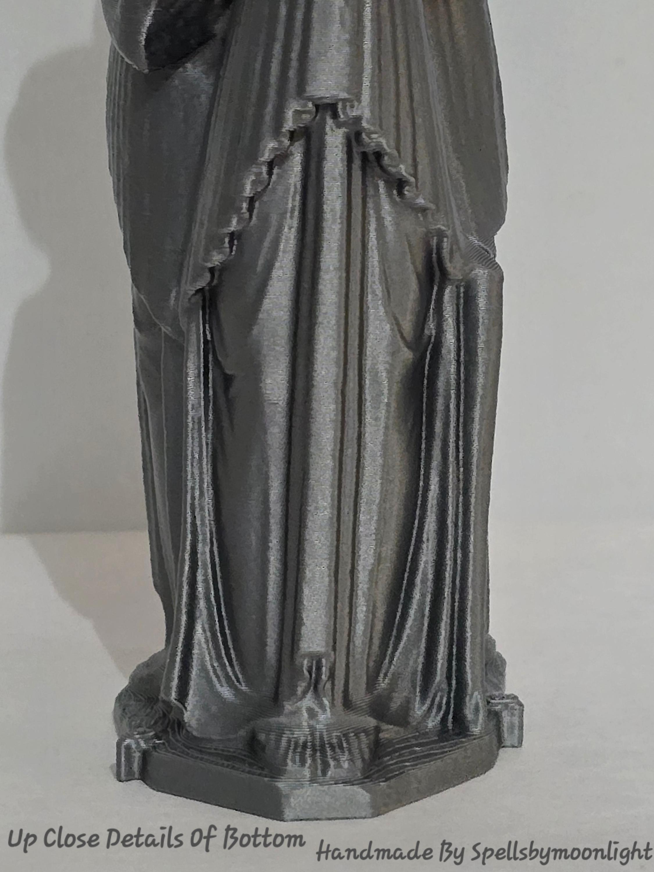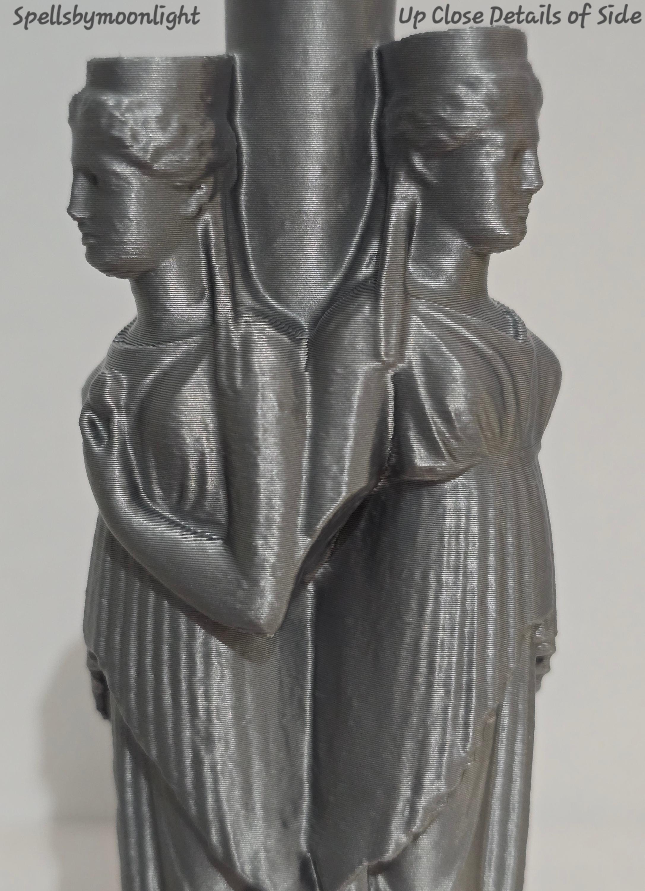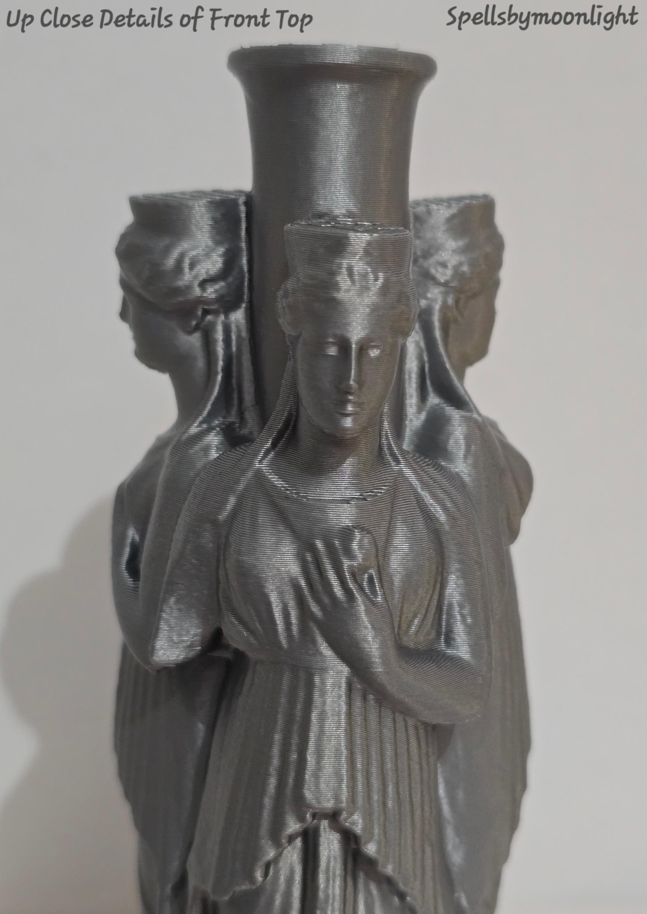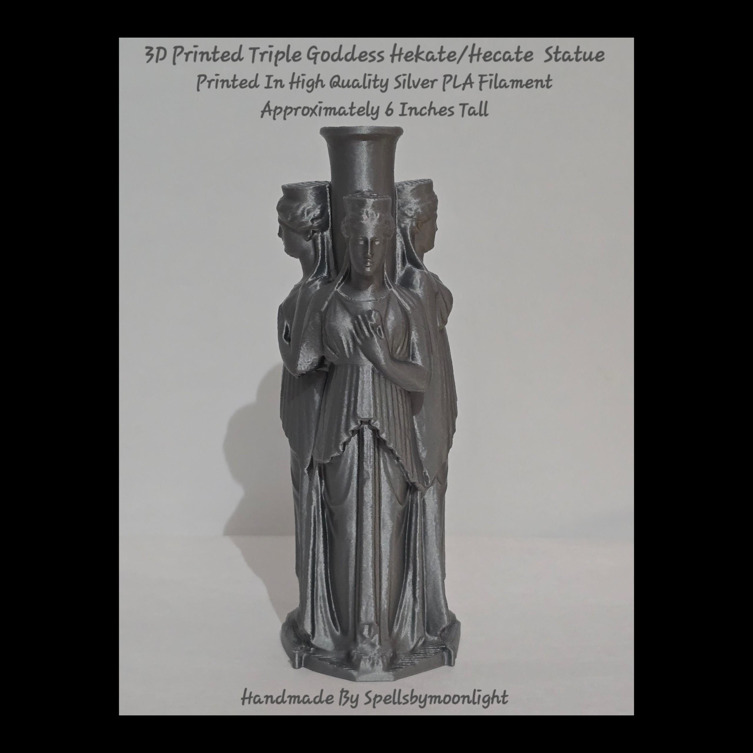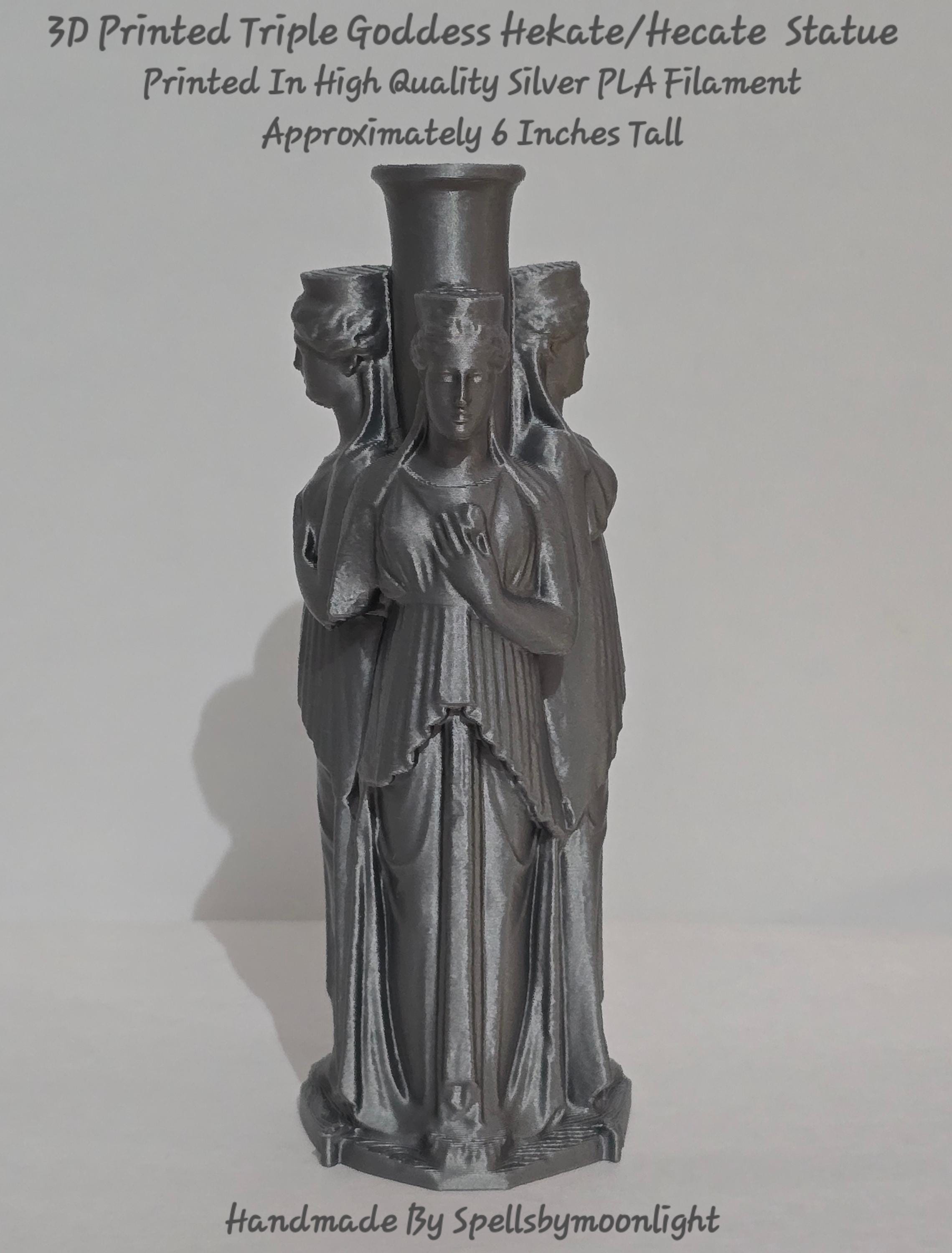 This listing is for One 3D Printed Triple Goddess Hekate/Hecate Statue in the color Silver. The Statues are not painted, they are Printed in High Quality PLA so you don't have to worry about paint chipping, peeling, or rubbing off! Please note that colors may differ slightly from how it appears on your screen due to varying monitor/Phone settings. The Statue is approximately 6 Inches Tall. If you hold the Statue close to your face you can see very minimal lines produced by the 3D Printer. At a normal distance they aren't noticeable. The lines are minimal in appearance because I have a high end 3D Printer! These Statues are perfect for Your Alter, as an offering to Hekate/Hecate, and also make great gifts! The artist Peter Farell, who I will give credit to below with a link did an amazing job at recreating Hecate on the Acropolis, including the slight lean of the Center Pillar that can be seen from a side view of the Statue! I love that this version is Historically correct!