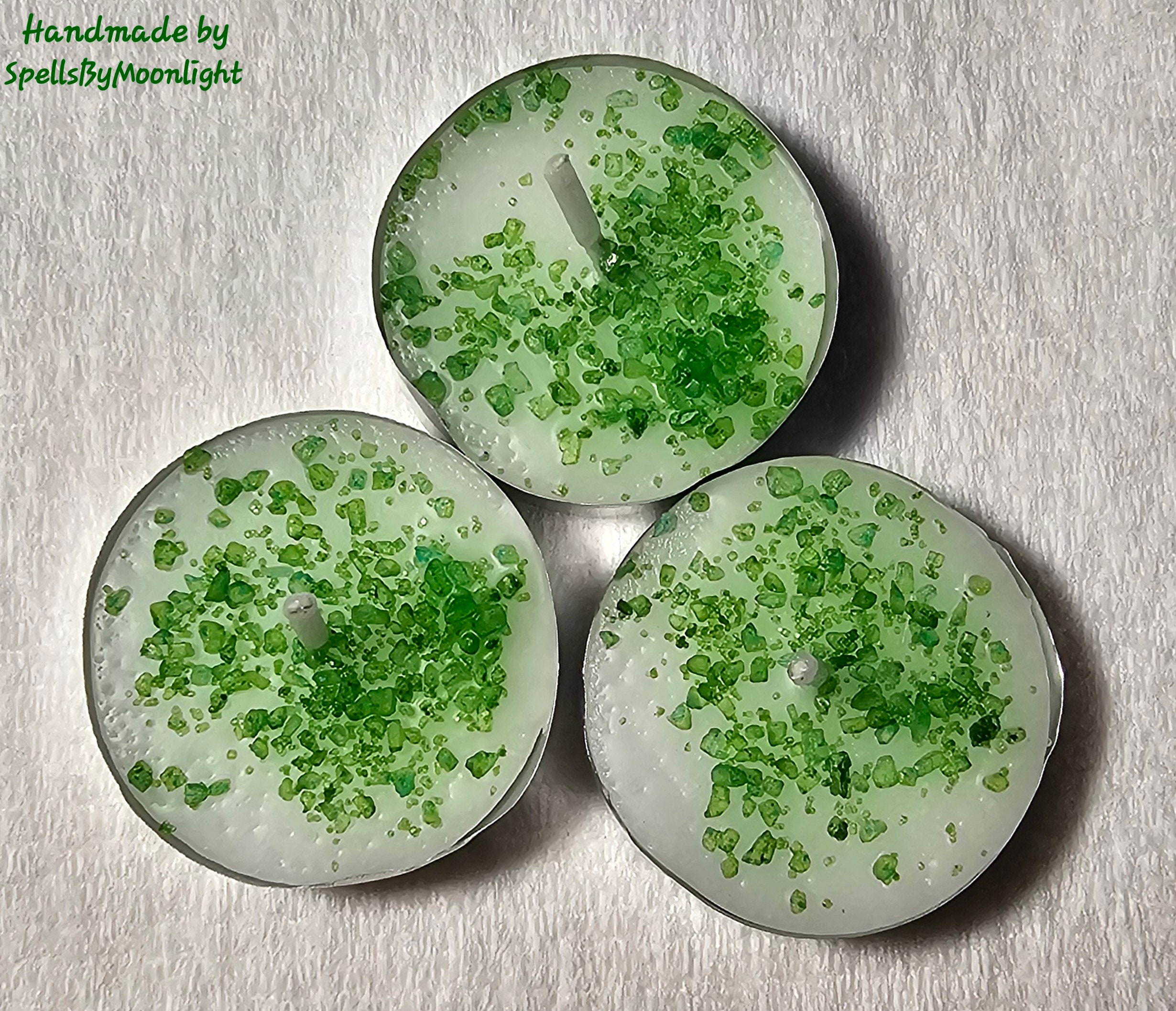 Need to do a quick spell? No time to set up a bunch of stuff? Or maybe you are traveling or meeting friends to do a spell & don't want to take a lot of supplies with you.. I created these Green Salt tealight candles to do quick spells to help you gain Prosperity and Abundance. Anything money related! The Green Salt is already on the candles, so all you have to do is set your intentions & light it! They come in a pack of 3